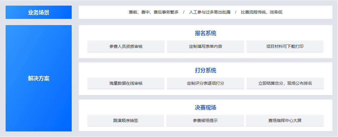 包括大赛报名、初审、网评、路演抽签、参赛后场提示、现场打分、评分统计、赛场指挥中心大屏等